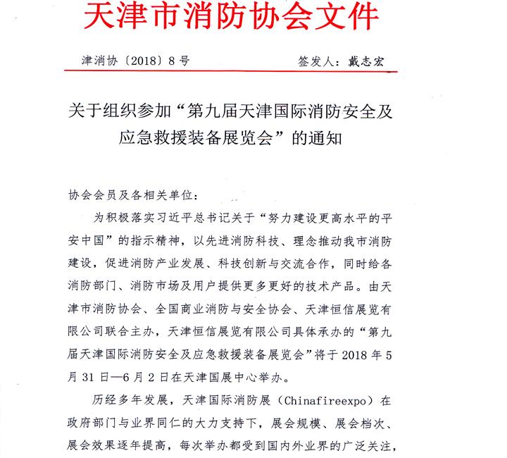 天津市消防協(xié)會(huì)-關(guān)于主辦2018第九屆天津消防展的通知