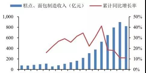飲食結(jié)構(gòu)的改變使得國內(nèi)消費(fèi)者對烘焙食品的消費(fèi)能力不斷提升,烘焙行業(yè)市場前景廣闊。隨著西式飲食文化逐漸滲入中國,烘焙食品消費(fèi)群體不斷擴(kuò)大,消費(fèi)者觀念進(jìn)一步轉(zhuǎn)變,對烘焙食品認(rèn)知度提高促使烘焙食品消費(fèi)加速升級,整個行業(yè)利潤和收入快速增長。據(jù)數(shù)據(jù)顯示,近兩年烘焙行業(yè)以及糕點、面包子行業(yè)銷售收入增長率一直穩(wěn)定在10%以上,制造利潤逐年攀升,市場處于快速成長的黃金期。