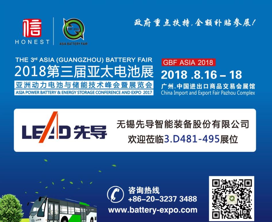 無錫先導(dǎo)智能裝備股份有限公司 將隆重出席8月16-18日在廣州琶洲.廣交會展館A區(qū)舉辦的GBF.ASIA 2018第三屆亞太電池展。