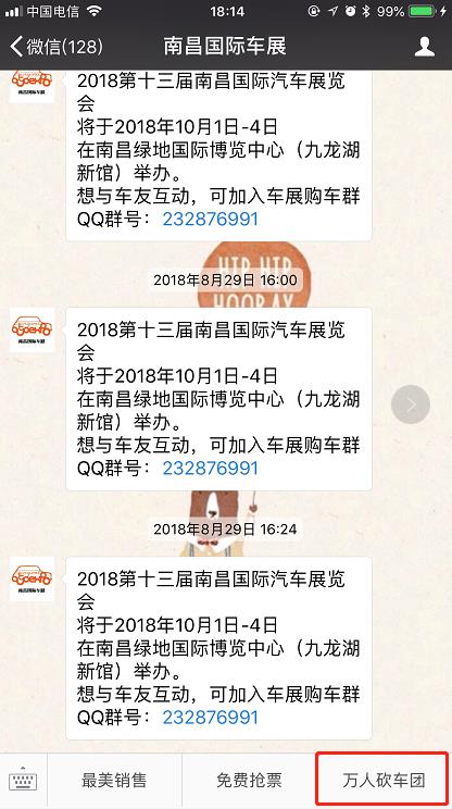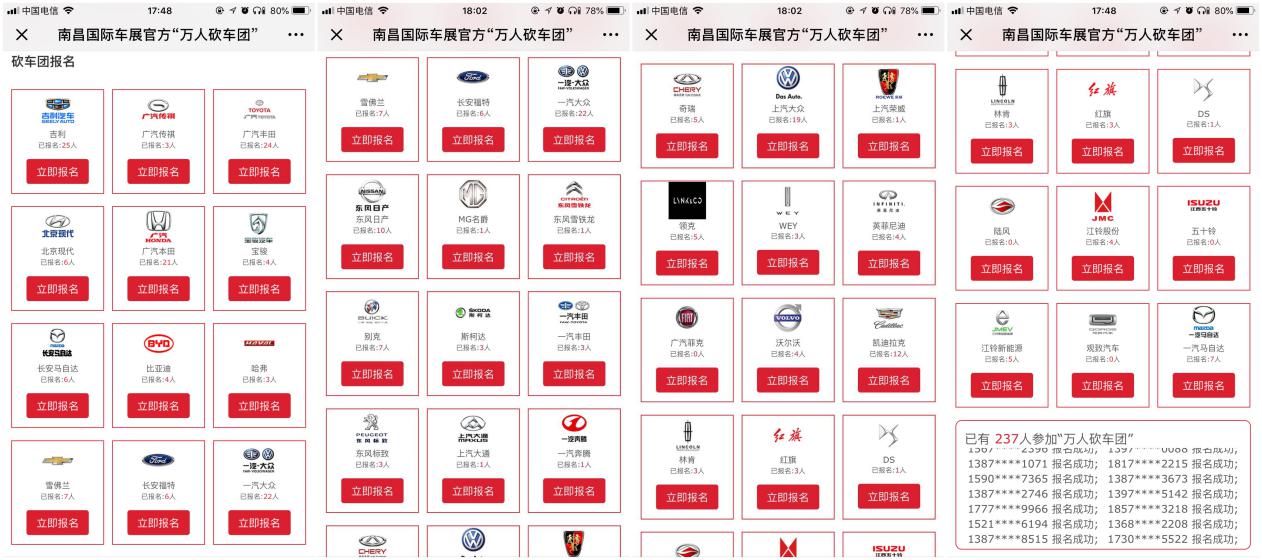 1、即日起至9月30日,通過(guò)微信關(guān)注“南昌國(guó)際車(chē)展”,點(diǎn)擊【萬(wàn)人砍車(chē)團(tuán)】按鈕進(jìn)入專(zhuān)題,選擇喜歡的汽車(chē)品牌即可免費(fèi)報(bào)名參加“南昌國(guó)際車(chē)展官方萬(wàn)人砍車(chē)團(tuán)”活動(dòng)(每人限報(bào)一個(gè)砍車(chē)團(tuán));