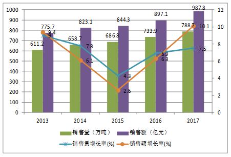 根據(jù)中國(guó)膠粘劑和膠粘帶工業(yè)協(xié)會(huì)的統(tǒng)計(jì)數(shù)據(jù),2013-2017年中國(guó)膠粘劑和密封劑行業(yè)一直保持著增長(zhǎng)的勢(shì)頭。2017年膠粘劑與密封劑的銷售量、銷售額分別為788.7萬(wàn)噸、987.8億元,分別增長(zhǎng)7.5%和10.1%。這充分說(shuō)明了2017年面對(duì)嚴(yán)峻形勢(shì)和艱難挑戰(zhàn),我國(guó)膠粘劑行業(yè)不斷提升質(zhì)量控制和技術(shù)管理水平,產(chǎn)業(yè)結(jié)構(gòu)調(diào)整穩(wěn)步推進(jìn),行業(yè)發(fā)展的技術(shù)基礎(chǔ)進(jìn)一步增強(qiáng)。