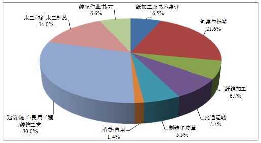 膠粘劑應(yīng)用市場(chǎng)增長(zhǎng)最快的應(yīng)用領(lǐng)域是建筑/施工/民用工程/裝飾工藝,占總應(yīng)用市場(chǎng)的30%,而包裝與標(biāo)簽用膠占21.6%,木工和細(xì)木工制品用膠占14.0%,交通運(yùn)輸用膠占7.7%。纖維加工、裝配作業(yè)、紙加工及書(shū)本裝訂、制鞋和皮革這四個(gè)領(lǐng)域,分別占5.5?6.7%之間。