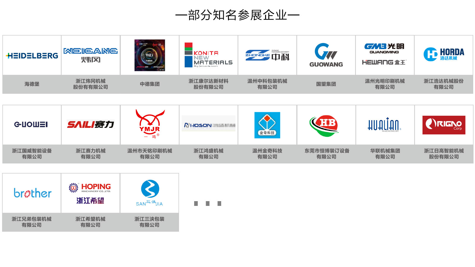 展會依托溫州——“中國印刷城”、“中國包裝機械城”、“中國印刷材料交易中心”、“中國印刷設備制造業(yè)第一區(qū)域品牌”、全球優(yōu)質(zhì)制造商聚集地產(chǎn)業(yè)高地優(yōu)勢和強勁的市場需求,吸引國內(nèi)外知名企業(yè)、品牌參展,展會展出產(chǎn)品涵蓋印刷、包裝、廣告標識、數(shù)碼印花、圖文快印等品類。海德堡、煒岡、中德、康爾達、中科、國望、光明、浩達、國威、賽力、天銘等印刷行業(yè)龍頭企業(yè)悉數(shù)參與展會;“智能包裝產(chǎn)業(yè)技術聯(lián)盟”成員華聯(lián)、日高、希望以及兄弟、三浹等包裝設備知名企業(yè)將攜新品展出;此外,博印、金奇、明睿等數(shù)碼印花、圖文快印、廣告標識企業(yè)也將共襄盛會。
