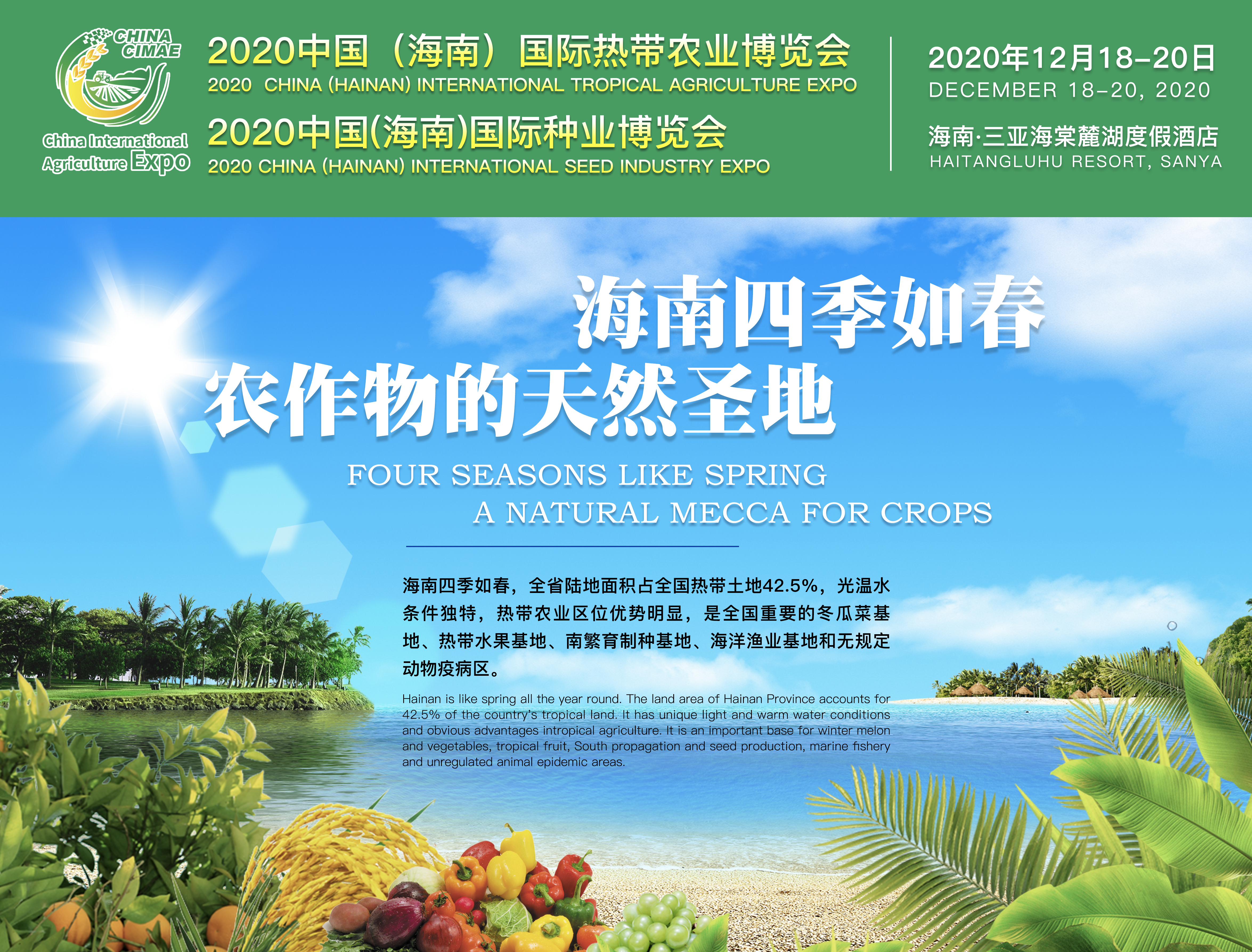 內(nèi)容摘要:農(nóng)業(yè),是關(guān)系國(guó)計(jì)民生的產(chǎn)業(yè),政府工作報(bào)告中明確提出:促進(jìn)農(nóng)林牧漁業(yè)和種業(yè)創(chuàng)新發(fā)展,加快建設(shè)現(xiàn)代農(nóng)業(yè)產(chǎn)業(yè)園和特色農(nóng)產(chǎn)品優(yōu)勢(shì)區(qū),穩(wěn)定和優(yōu)化糧食生產(chǎn)。2020年伊始,全國(guó)各行各業(yè)遭遇新冠肺炎疫情影響,對(duì)我國(guó)農(nóng)業(yè)發(fā)展以及目標(biāo)實(shí)現(xiàn)造成了重大困難。如何將疫情對(duì)“三農(nóng)”影響降到最低,保證糧食等重要農(nóng)產(chǎn)品穩(wěn)產(chǎn)保供,成為上至政府、下至市場(chǎng)、各相關(guān)企業(yè)面臨的一道重要課題。國(guó)家商務(wù)部為支持會(huì)展業(yè)快速發(fā)展,出臺(tái)文件并提出13項(xiàng)具體要求。海南國(guó)際熱帶農(nóng)業(yè)博覽會(huì)作為海南省唯一的農(nóng)業(yè)高新技術(shù)、生產(chǎn)資料交流貿(mào)易平臺(tái),為積極應(yīng)對(duì)肺炎疫情、助力農(nóng)業(yè)發(fā)展,特推出“商旅+食宿一條龍會(huì)展新模式”。