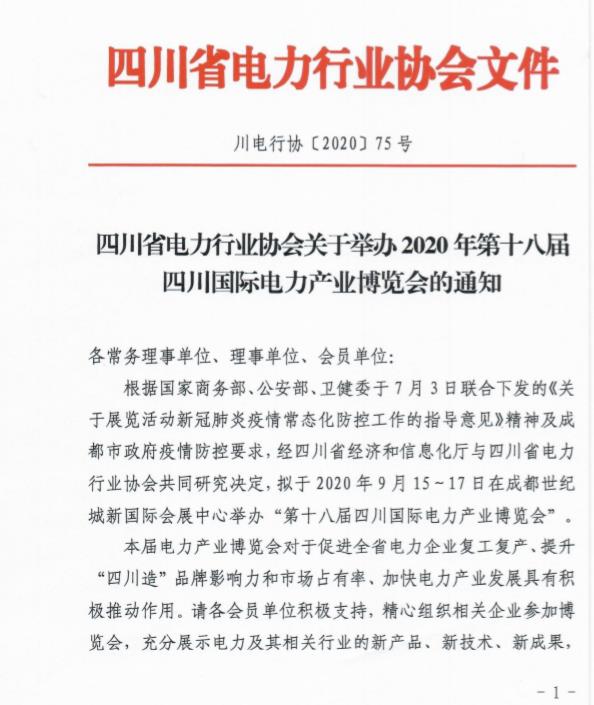 四川省電力行業(yè)協(xié)會關(guān)于舉辦2020年第十八屆四川國際電力產(chǎn)業(yè)博覽會的通知