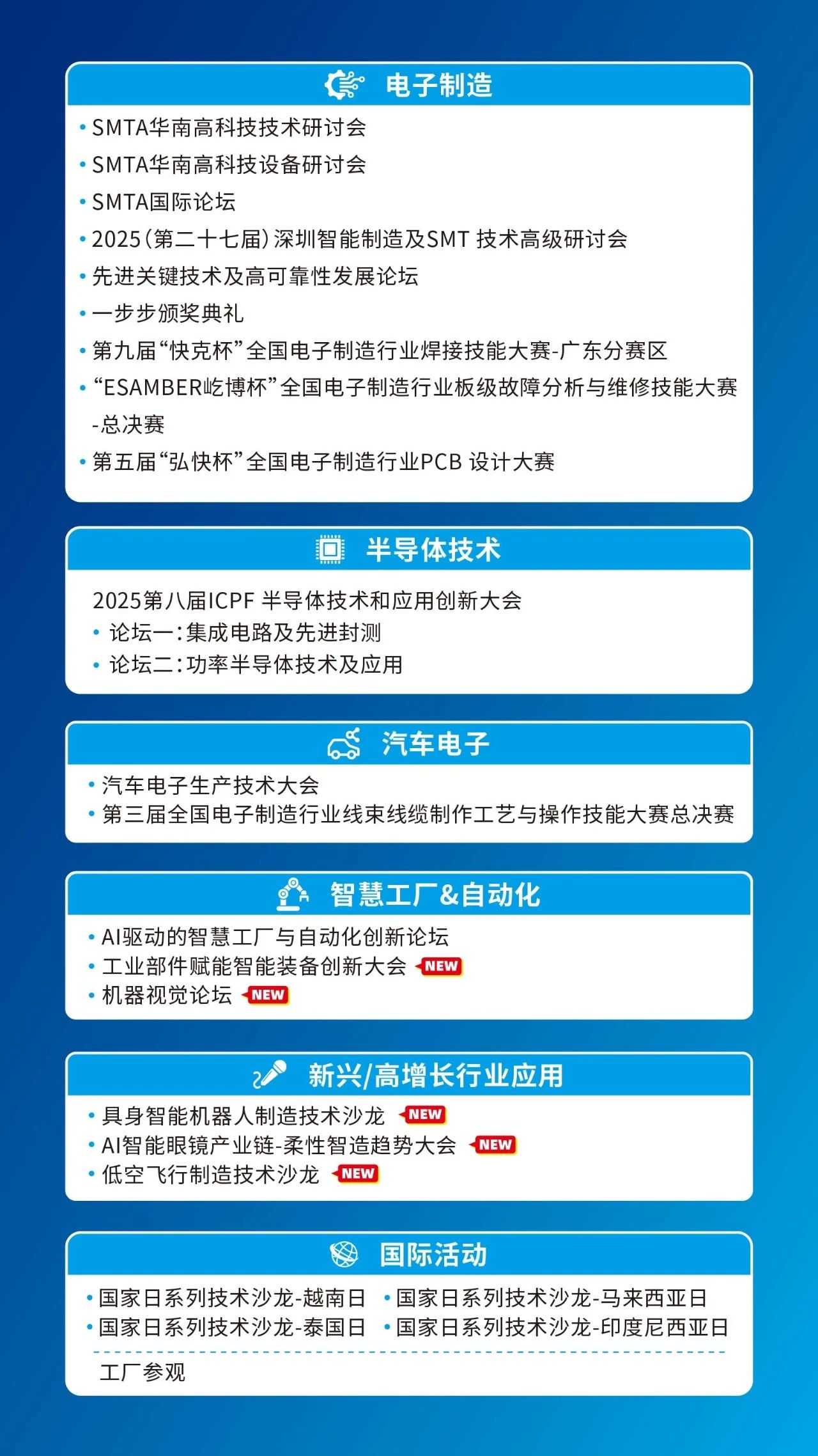 在AI終端、圖像傳感、半導(dǎo)體芯片等關(guān)鍵領(lǐng)域持續(xù)領(lǐng)跑,成功實現(xiàn)技術(shù)創(chuàng)新與多場景應(yīng)用的深度融合。NEPCON ASIA 2025針對具身智能機器人、低空飛行、智能工廠、機器視覺、半導(dǎo)體、電子制造等領(lǐng)域開展40場會議論壇及賽事活動,深度整合國內(nèi)外行業(yè)協(xié)會組織、專家、科研人員、資深從業(yè)者、行業(yè)應(yīng)用終端及行業(yè)媒體等資源,探討電子制造現(xiàn)狀與未來發(fā)展趨勢,實現(xiàn)業(yè)務(wù)的持續(xù)增長,共同拓展市場新未來!